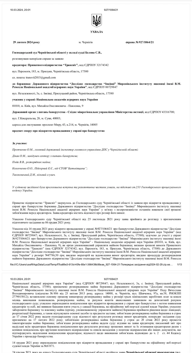 Перший крок щодо порятунку ДП «ДГ «Івківці» здійснило аж ніяк не керівництво НААН, а головні кредитори, які постановили на своїх зборах відсторонити «кишенькового» арбітражного керівника та директора ДП, який завів господарство в боргову яму. А оскільки розпорядник майна не виконав рішення суду і не зібрав всіх кредиторів, то головні кредитори звернулись до правоохоронців з тим, щоб ініціювати проти нього відкриття кримінального провадження за невиконання судової ухвали. Якщо справа дійде до суду, то арбітражний керівник може гасити борги, які він пропустив, власним майном.