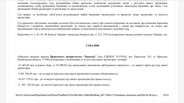 Цікаво те, що відповідно до укладених договорів сума основного боргу становить два мільйони 650 тисяч гривень. А пеня за період прострочення із 23.11.2021 по 13.01.2022 становить 66 мільйонів 721,92 гривень. Ще майже 16 тисяч гривень нарахували на інфляцію та 530 тисяч гривень – на штраф. Загальна ж сума кредиторських вимог ПП «Трансвіт» до ДП «ДГ «Івківці» складає понад сімдесят мільйонів гривень.
