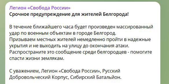 Російські добровольці, залучені в операції щодо прориву кордону РФ, звернулись з терміновим повідомленням. Вони анонсували масований обстріл Бєлгорода через годину.