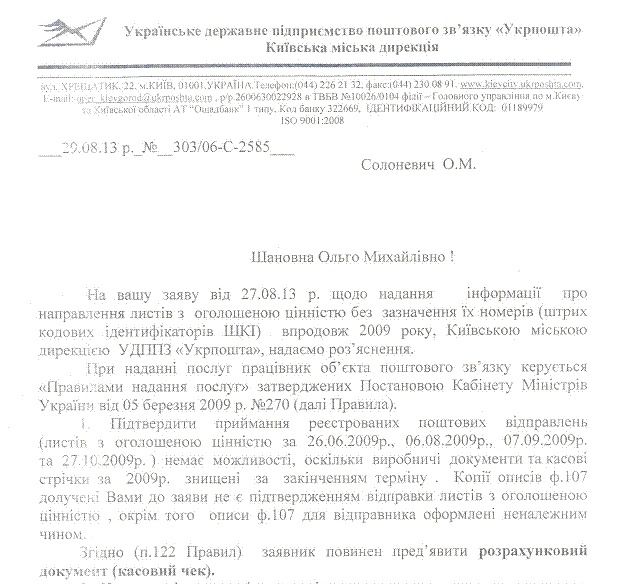 Подтверждает вывод КНИИСЭ и предоставленная суду справка из Укрпочты, из которой следует, что доказательств отправления в указанный период с почтового отделения № 151 г. Киева, уведомлений на адрес Солоневич не существует. А работники отделения почты ВПЗ-151, подписи, проставленные на документах, своими не признали. Заместитель директора по вопросам технологии Князева Н.П. обращает внимание заявителя на то, что в качестве подтверждающего отправление документа, должны быть предьявлены кассовые чеки, либо расчетные квитанции. Как уже было сказано выше, и этих документов не существует.