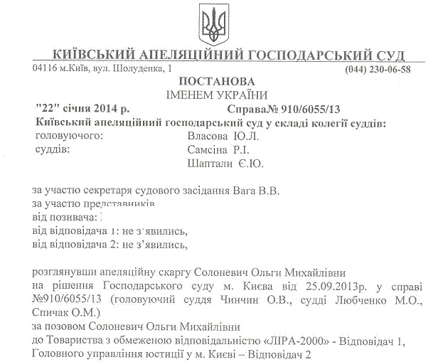 Понятно, что такая несправедливая сделка не могла обрадовать Ольгу Солоневич. После отказа Ольги принять предложенные ей отступные за отобранные корпоративные права, судебная тяжба разгорелась с новой силой. Был подан иск о признании недействительным решения общего собрания ТОВ «Лира-2000» про исключение Солоневич из числа участников. 22 января 2014 года Киевский апелляционный Хозяйственный суд вынес постановление об удовлетворении требований Ольги Солоневич и восстановил ее права в полном объеме.