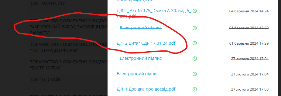 Однак наступні теж не додали документи, які не було подано у складі пропозицій. Наприклад, фірма «Анва» (28,73 млн грн) не захотіла надавати довідку про виконання аналогічних угод, яку мала б зробити сама. Тобто це не довідка, яку отримують у якихось державних бюрократів, а фірма просто мала б сама повідомити про свої контракти. Але не захотіла. Ще один учасник «Екстрім-текс» не захотів подати дані про фінансову звітність.