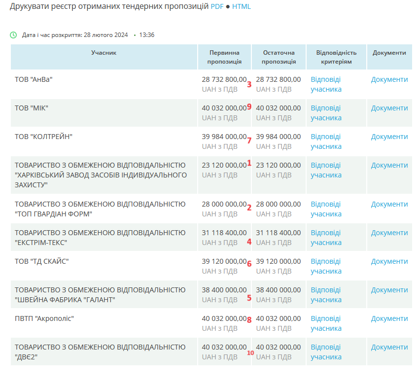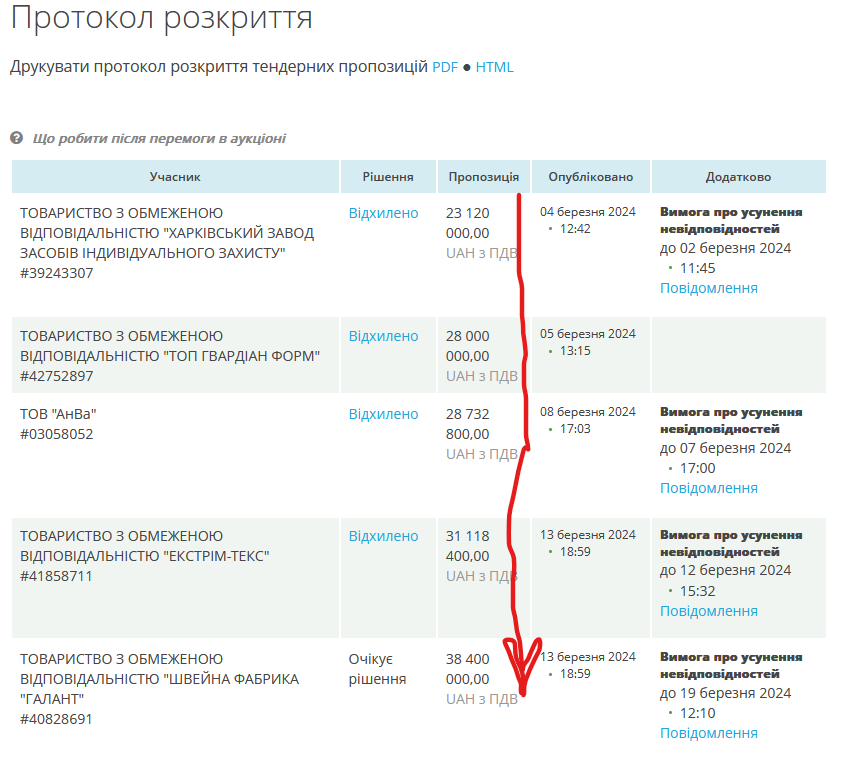 В результаті таких відмов черга дійшла до ТОВ «Швейна фабрика «Галант», чия пропозиція 38,40 млн грн вже всього на 4% дешевша від очікуваної вартості. Різниця з переможцем аукціону «Харківським заводом» становить 15 млн грн. Тобто це та сума, яку «Державний оператор тилу» буде змушений заплатити лише за те, що перший переможець аукціону відмовився від свого результату. А у випадку, якщо й «Галант» відмовиться довантажувати документи, які він також “передбачливо” не завантажив одразу, то перейдуть до ще дорожчої пропозиції.
