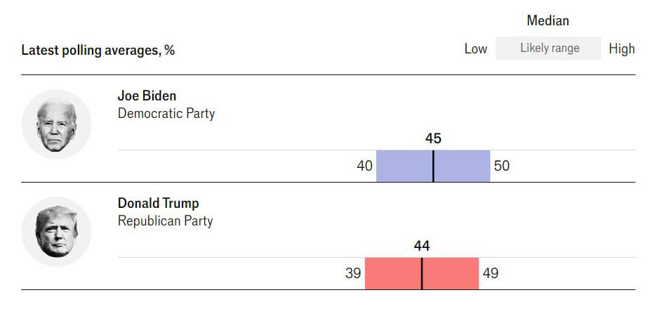 За даними The Economist по опитуваннях, шанси Трампа на перемогу оцінювалися нижче, ніж у Байдена, увесь період з грудня 2022 року по серпень 2023-го. А вже з минулої осені та по цю весну експрезидент Штатів мав більший відсоток, аж по нині, коли чинний глава держави таки зміг вирватися вперед.
