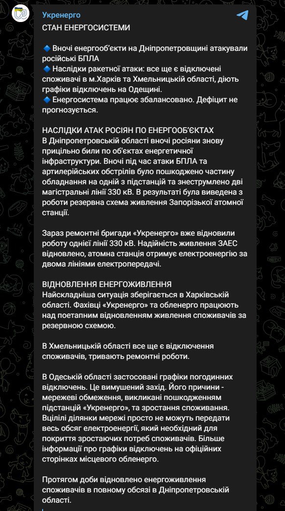 "Під час атаки БПЛА та артилерійських обстрілів було пошкоджено частину обладнання на одній із підстанцій та знеструмлено дві магістральні лінії 330 кВ. В результаті було виведено з ладу резервну схему живлення Запорізької атомної станції", – заявили в "Укренерго".