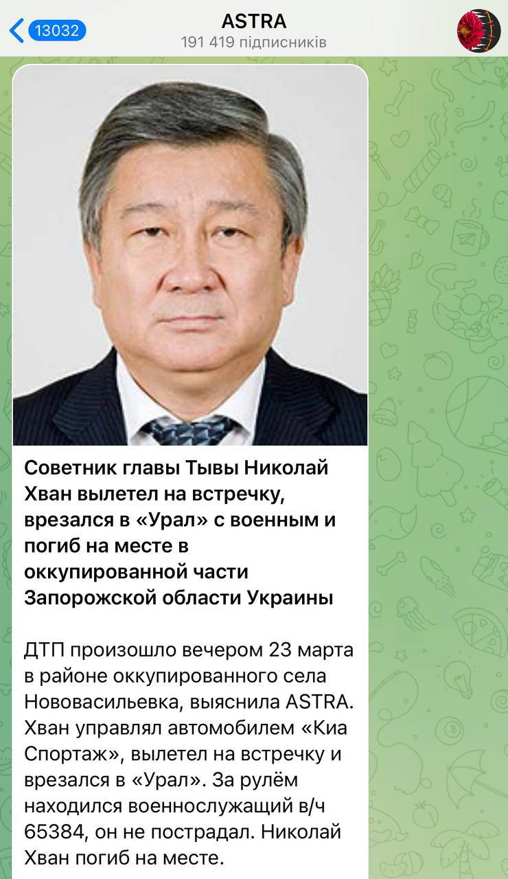Радник голови російської республіки Тива Микола Хван загинув у результаті аварії у тимчасово окупованій частині Запорізької області.
