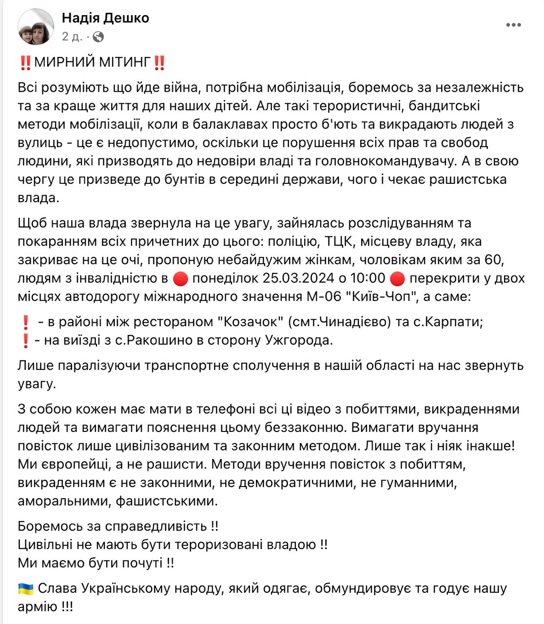 "Всі розуміють, що йде війна, потрібна мобілізація, боремося за незалежність і за краще життя для наших дітей. Але такі терористичні, бандитські методи мобілізації, коли у балаклавах просто б’ють та викрадають людей з вулиць – це неприпустимо, оскільки це порушення всіх прав та свобод людини, які призводять до недовіри до влади та головнокомандувача. А у свою чергу це призведе до бунтів усередині держави, на що й чекає рашистська влада", – пишуть організатори.