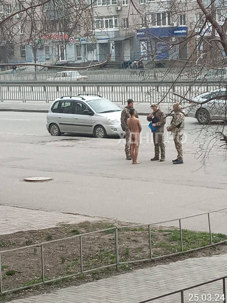 Незвичайне фото з Дніпра, де військовий патруль розмовляє із абсолютно голим чоловіком.