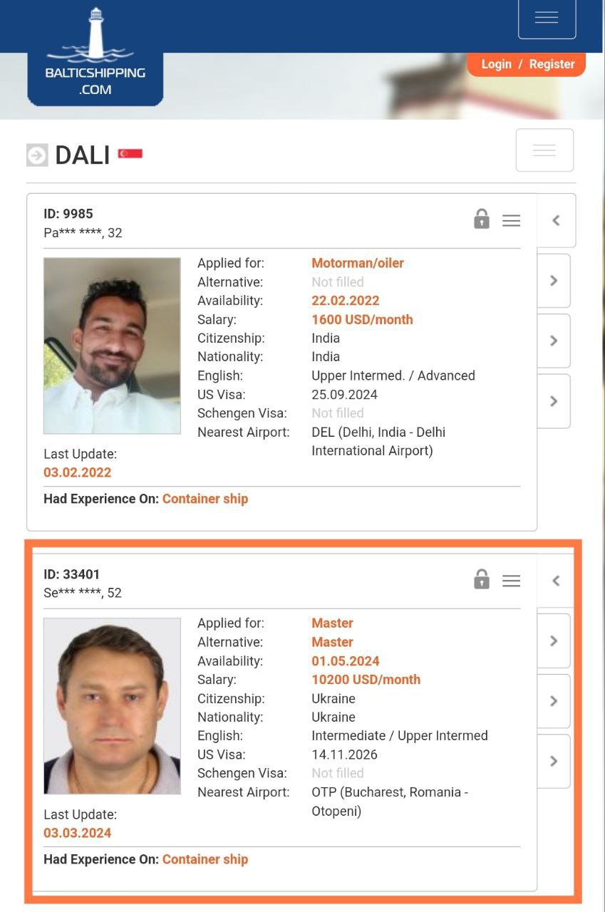 "Останній відомий контракт: капітан, контейнеровоз, підписання 19 лютого 2024 року", – пише портал. Також повідомляється зарплата ймовірного капітана – 10 200 доларів.