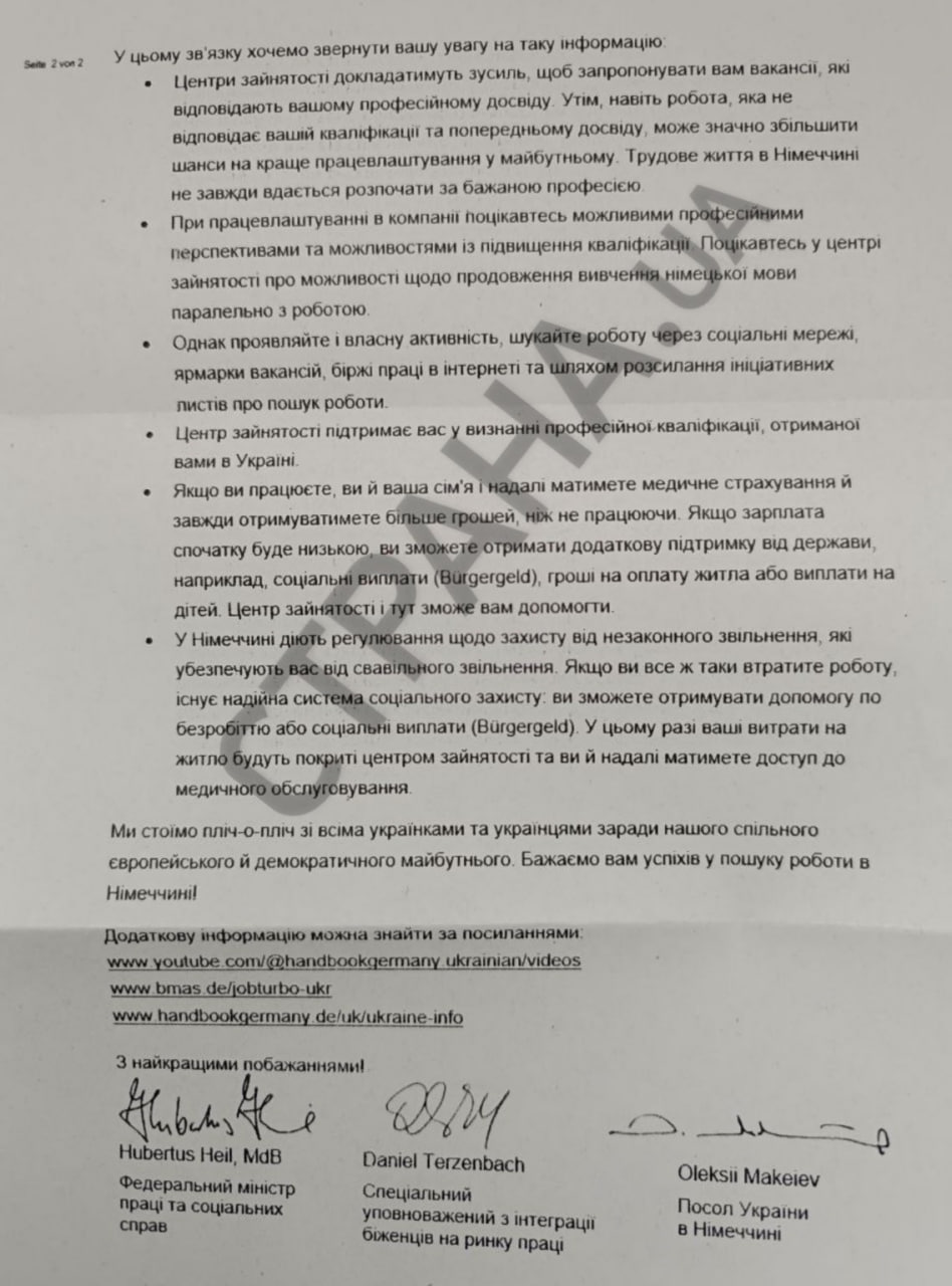 Такий лист почали отримувати українці, які мешкають у Німеччині. Його підписали, окрім Макєєва, німецький міністр праці Хубертус Хайль та уповноважений з інтеграції біженців Даніель Терценбах.
