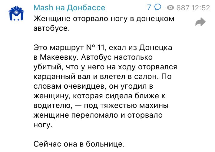 Як пишуть російські канали, під час руху автобуса "Донецьк — Макіївка" біля транспортного засобу відірвався карданний вал, що влетів у салон, переламав та відірвав ногу пасажирці.