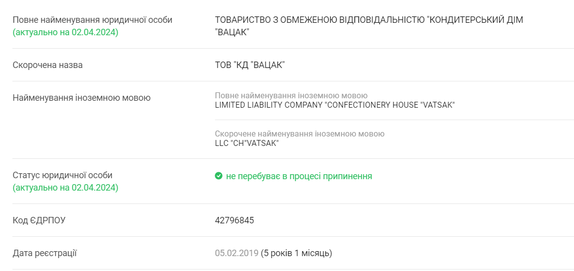 З кондитерським бізнесом так само не все просто. Згідно з даними реєстрів КД «Вацак» зареєстровано тільки у 2019 році, хоча на сайті підприємства зазначається, що створено воно було у 2001 році. Тобто дослідити, що відбувалось з фінансовими потоками компанії за період строком у 18 років не видається можливим.
