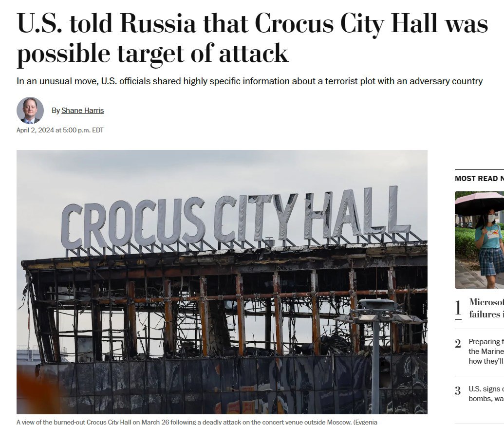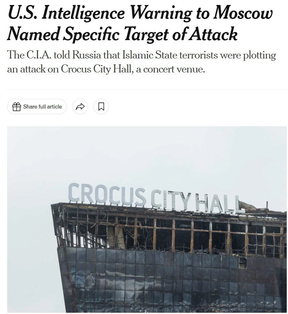 The New York Times і Washington Post, з посиланням на джерела, пишуть, що США попереджали Росію, що саме "Крокус Сіті Холл" може стати ціллю теракту.