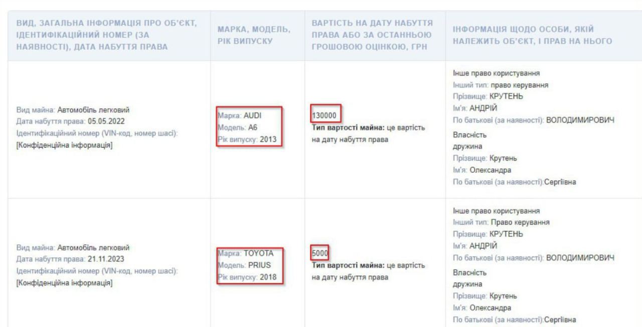 У Олександри Крутень є два авто: Audi A6 (2013 року випуску), яке вона придбала у 2022 році за 130 тис. грн, та Toyota Prius (2018 року випуску), вартістю всього 5000 грн – власницею другого авто дружина патрульного стала у 2023 році. Варто додати, що на профільних сайтах з продажу авто, вживаний Toyota Prius (2018 року випуску) можна придбати приблизно за 20 тис. доларів. Обома авто може користуватися Андрій Крутень.