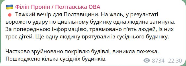 Ракетний удар по Полтаві: унаслідок атаки є загиблий і поранені