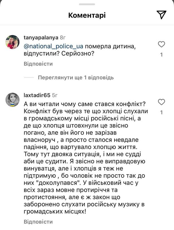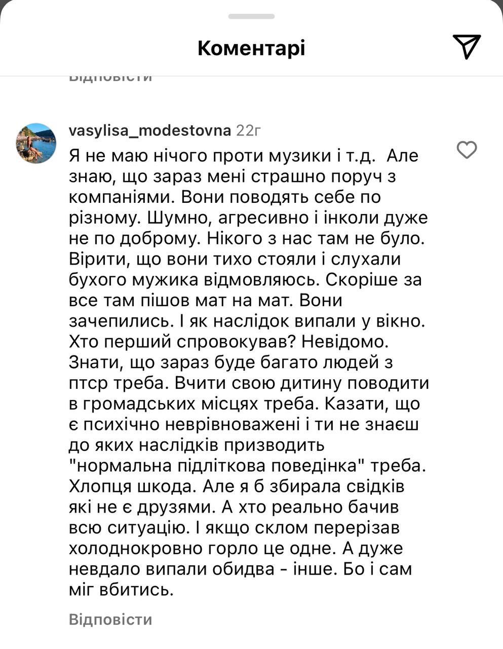 За її словами, під постами, присвяченими смерті парубка, з’явилися негативні коментарі про те, що насправді працівника УДО спровокувала російська музика, яку слухали підлітки. Проте дівчина стверджує, що на той момент ніхто з них не слухав музики.