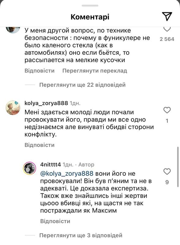 «Після того, як фунікулер доїхав, Максим та його друзі вийшли через нижні двері, Максим був останнім. Питання: чому чоловік (Косов, — Ред.) не вийшов через двері, які були поруч із ним? Чому він слідував за Максимом? Це говорить про те, що Косов хотів спровокувати та вбити Максима», — каже дівчина.