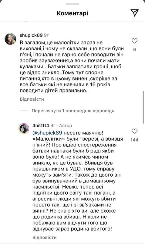 На скріншотах – коментарі під постами дівчини, присвяченими смерті підлітка. Частина користувачів вважають, що це було ненавмисне вбивство.