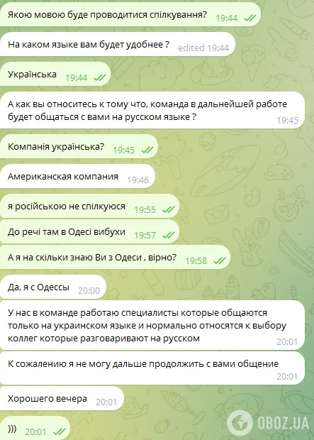Коли ж HR-спеціалістка уточнила в чоловіка, чи не проти той, якщо у майбутньому співробітники спілкуватимуться з ним російською, відбувся такий діалог: