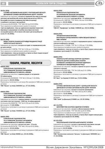 У ВДЗ № 1 (299) за квітень 2008 року, на сторінці 40 за номером 00032 (ТРП) опубліковане офіційне повідомлення, що Комунальне підприємство по утриманню зелених насаджень Шевченківського району м. Києва 4.04.2008 замовило ТОВ СП “Украфлора” розсаду квітів, 31 найменування на суму 1 499 946 грн.
