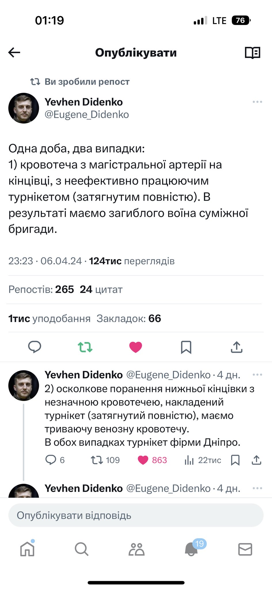 “4 дні тому стабпункт “Азова” повідомляв про смерть пораненого з повністю затягнутим турнікетом “Дніпро”, який НЕ зупинив кровотечу”.