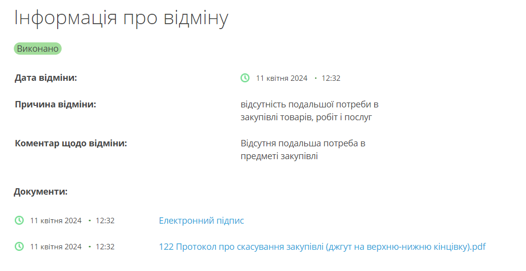 Пізніше, 11 квітня, о 12:32 тендер скасували й причиною відміни назвали “відсутність подальшої потреби в закупівлі товарів, робіт і послуг”.