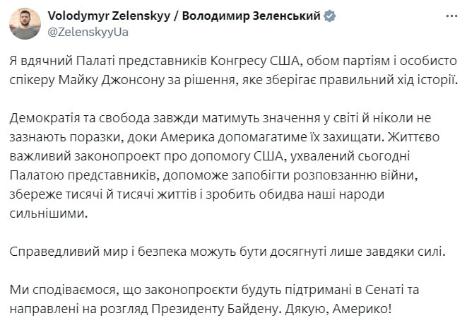 Зеленський подякував Палаті представників США за схвалення допомоги Україні