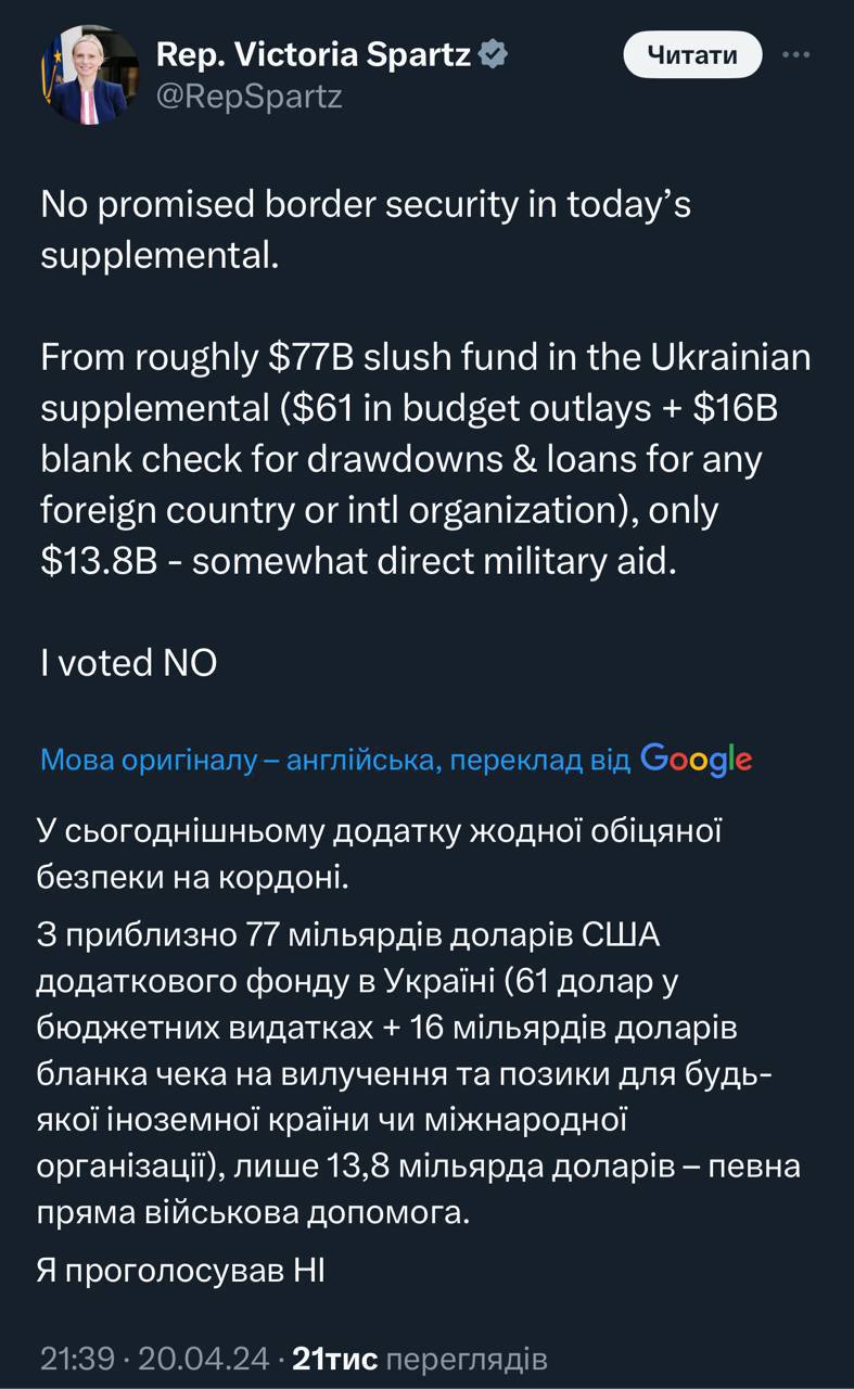 Єдина українка у палаті представників — Вікторія Спарц проголосувала проти підтримки надання допомоги Україні.