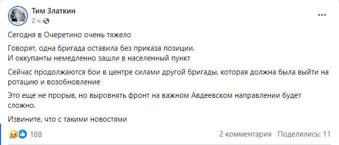 «Сьогодні в Очеретиному дуже важко. Говорять, одна бригада залишила без наказу позиції», – написав Златкін.