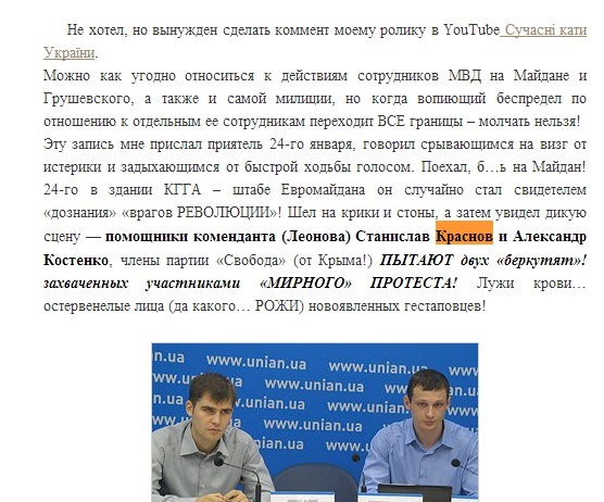 Тогда парни прославились благодаря появившейся в интернете аудиозаписи, на которой слышно как кто-то пытает захваченных в плен бойцов Беркута. Герои этой записи – якобы Костенко и Краснов