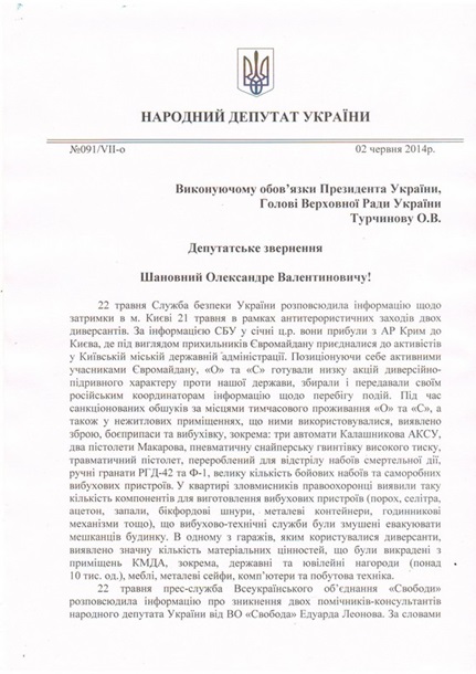 Речь в выступлении шла именно об аресте двух помощников-консультантов народного депутата Украины от «Свободы» Эдуарда Леонова.