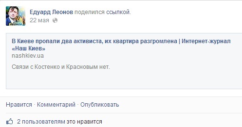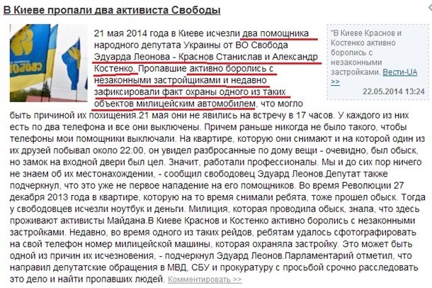 22 мая в пресс-службе партии «Свобода» заявили о том, что в Киеве пропали два помощника народного депутата Украины Эдуарда Леонова.