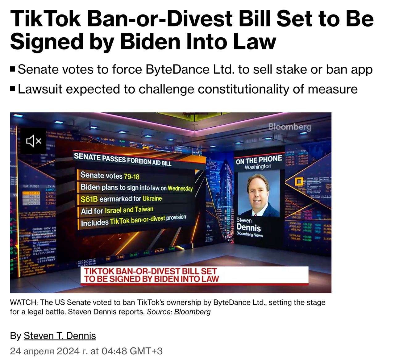 Китайською материнською компанії ByteDance заборонили володіти TikTok. Їй дають майже рік на те, щоб продати актив, інакше додаток буде заборонено у США.
