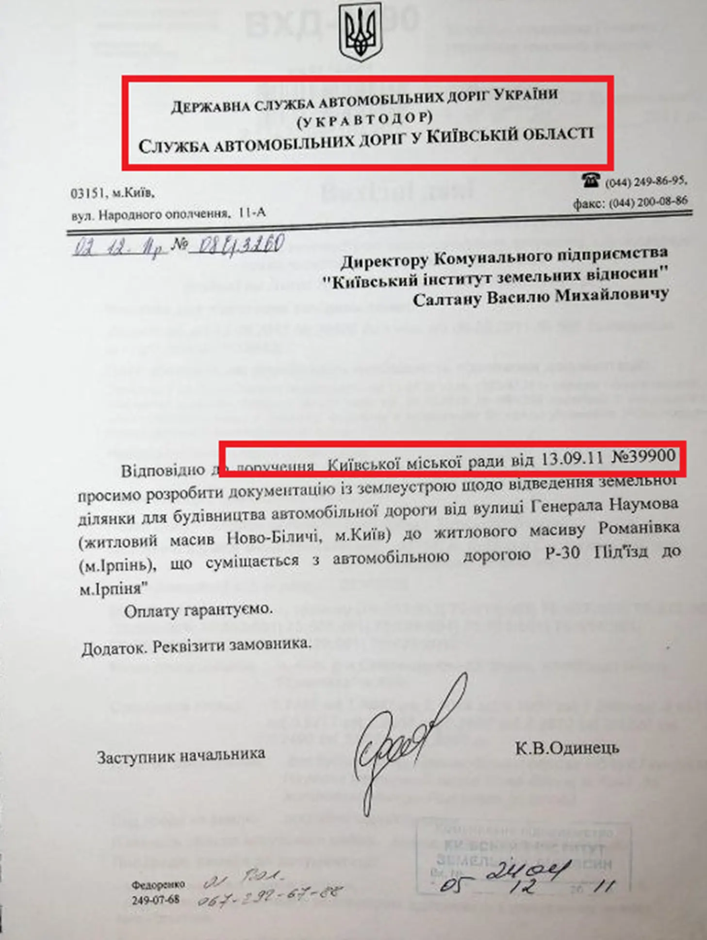 “Укравтодор” у 2011 році направив листа комунальному підприємству “Київський інститут земельних відносин” і наголошував, що відповідно до доручення Київської міської ради просить зробити документацію із землеустрою щодо відведення земельної ділянки для будівництва цієї дороги.