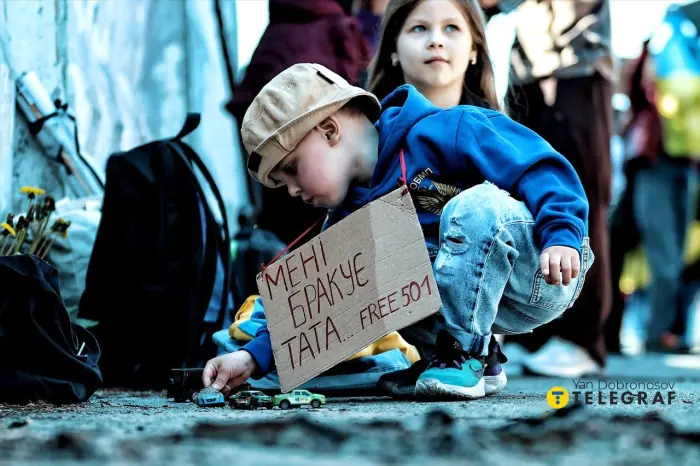 Як зазначив кореспондент “Телеграф”, діти тримали плакати з написами: “Поверніть мені тата”, “Мені бракує тата”, “У когось свято, а я чекаю на тата”.
