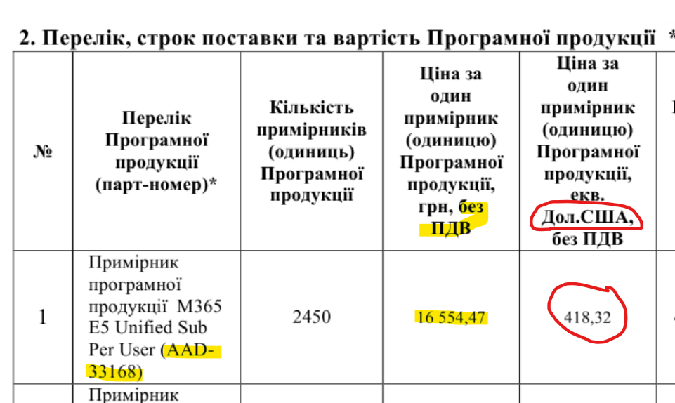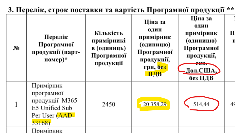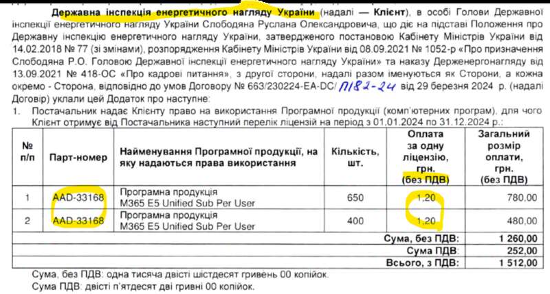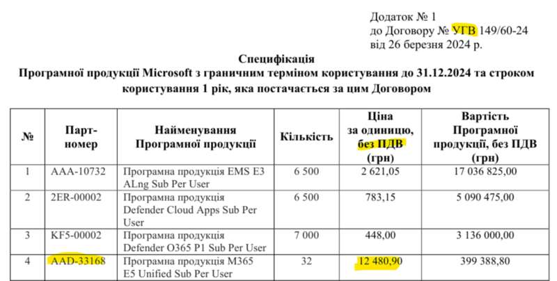 Найбільшу частку в закупівлі «Укрексімбанку» зайняли пакети офісних програм M365 E5 Unified Sub Per User (AAD-33168). Замовили ліцензії на 2024 рік по 16 793 грн/шт або $354, на 2025 – по 19 865 грн/шт або $418, на 2026 – по 24 430 грн/шт або $514. При цьому ціни у контракті зафіксовано у доларі, і прямо передбачено зростання саме доларової ціни ліцензій.