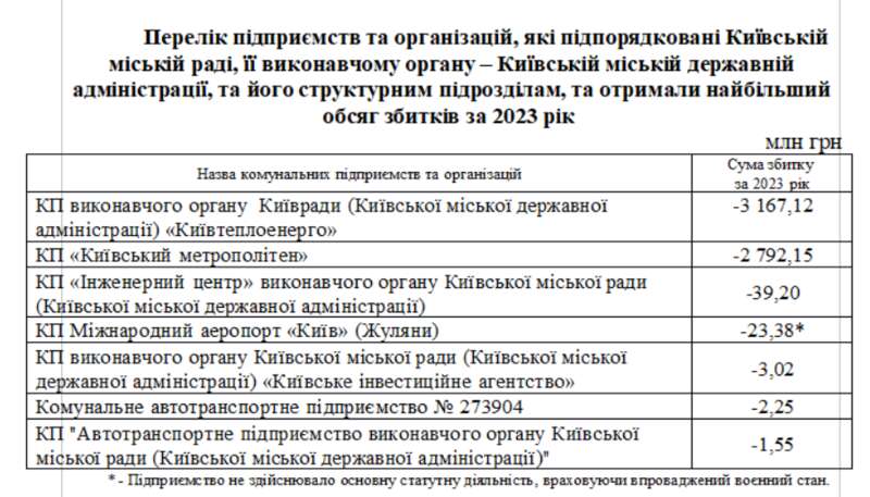 Минулоріч загальні збитки столичних комунальних підприємств установ та організацій склали 6,03 млрд гривень, що майже втричі більше, ніж у 2022 році. “Рекордсменами по збитковості” стали “Київтеплоенерго” і “Київський метрополітен”, які недорахувалися більш ніж 5,9 млрд гривень, “бронзу" "завоювало” КП “Інженерний центр”.