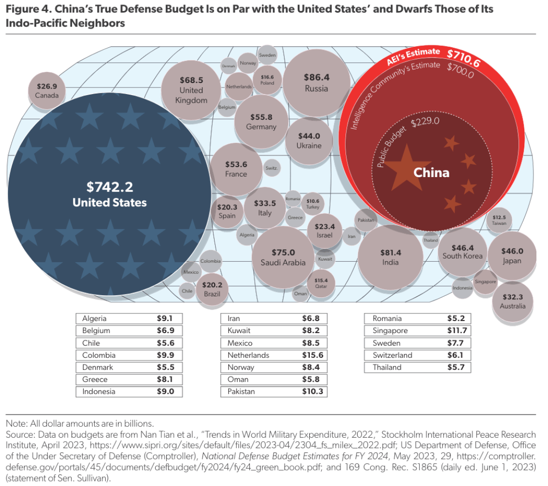 Оприлюднений китайський військовий бюджет є неточним і не відображає масштабного нарощування військового потенціалу та широкомасштабної модернізації збройних сил Китаю. Після врахування економічних поправок і оцінки обґрунтованих, але не врахованих витрат, реальний розмір військового бюджету КНР у 2022 році зріс до 711 млрд доларів. Це втричі більше, ніж офіційно заявлено Пекіном, а також майже дорівнює американському бюджету того ж року.