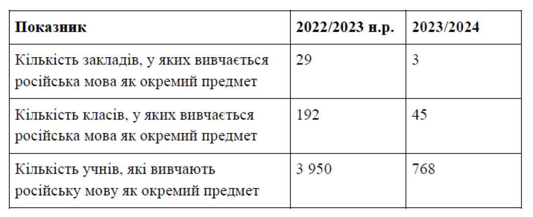 У той же час, йдеться в документі, в Україні залишилися три школи, в яких російська мова викладається як окремий предмет. У 2023/2024 навчальному році лише 768 школярів вивчають російську мову як окремий предмет.