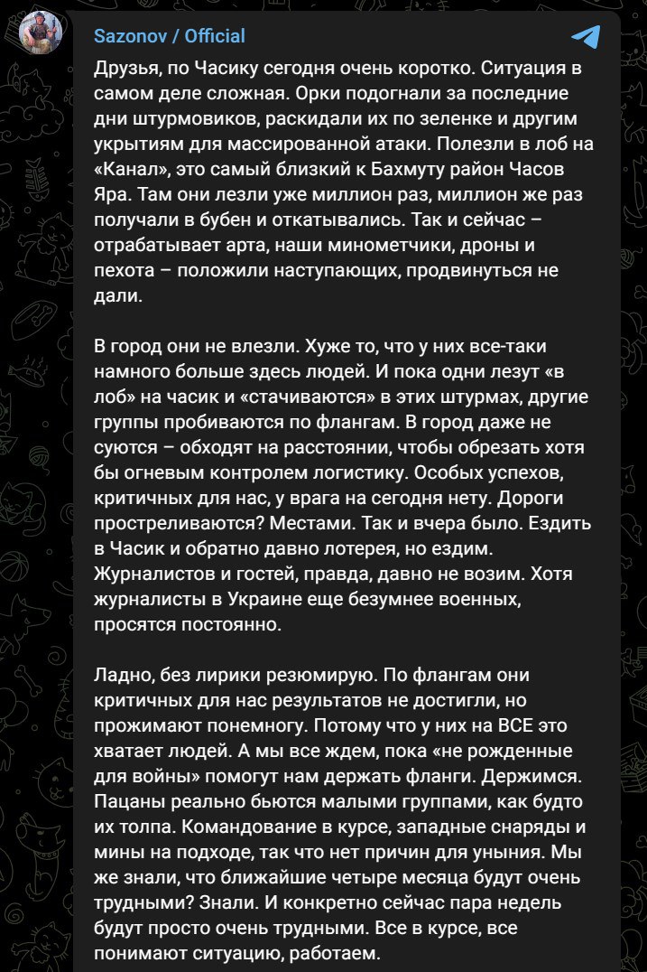 Сазонов пише, що одні частини РФ атакують місто в лоб, зазнаючи втрат, але інші обходять Часів Яр по флангах, щоб поставити під вогневий контроль логістику ЗСУ. Дороги, за його словами, "місцями прострілюються".
