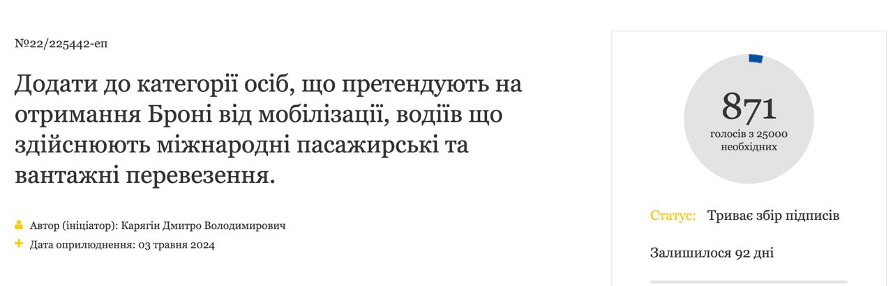 "Додати до категорії осіб, які претендують на отримання броні від мобілізації, водіїв, які здійснюють міжнародні пасажирські та вантажні перевезення", - йдеться в ній.