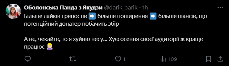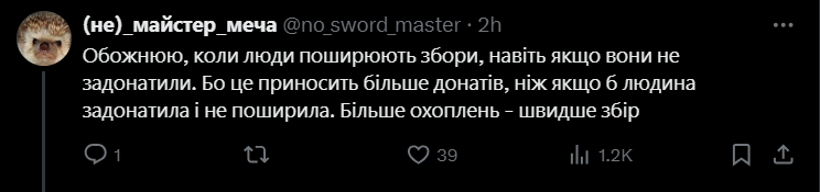 “Прекрасний день, щоб вас назвали тупим за те, що лайкаєш збори. Воно то факт, що збір закривається донатами, але ж не у всіх фінансове становище дозволяє підтримувати всі збори, а саме будь-яка активність щодо збору підійме охоплення і дасть можливість іншим задонатити”.