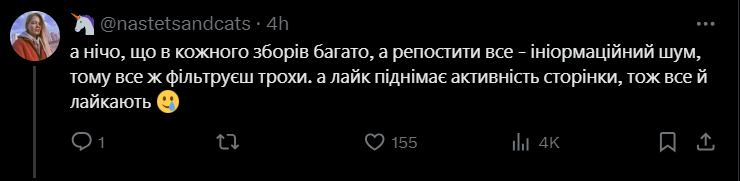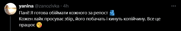 Одна з користувачок зазначила: “Гарний репост може забезпечити більше, ніж може донат однієї людини, бо це розширення аудиторії. І так, будь-яка активність під постом/сторіс допомагає просуванню. Я періодично проводжу збори і прямо розписую окремо, як безоплатно можна допомогти”.
