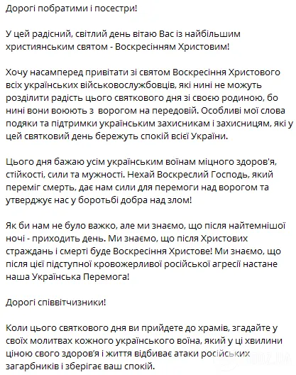 "Як би нам не було важко, але ми знаємо, що після найтемнішої ночі – приходить день. Ми знаємо, що після Христових страждань і смерті буде Воскресіння Христове! Ми знаємо, що після цієї підступної кровожерливої російської агресії настане наша Українська Перемога!" – наголосив він.