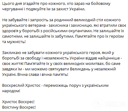 "Особливі мої слова подяки та підтримки українським захисникам і захисницям, які у цей святковий день бережуть спокій всієї України. Цього дня бажаю усім українським воїнам міцного здоров’я, стійкості, сили та мужності. Нехай Воскреслий Господь, який переміг смерть, дає нам сили для перемоги над ворогом та утверджує нас у боротьбі добра над злом!" – написав Головком ЗСУ.