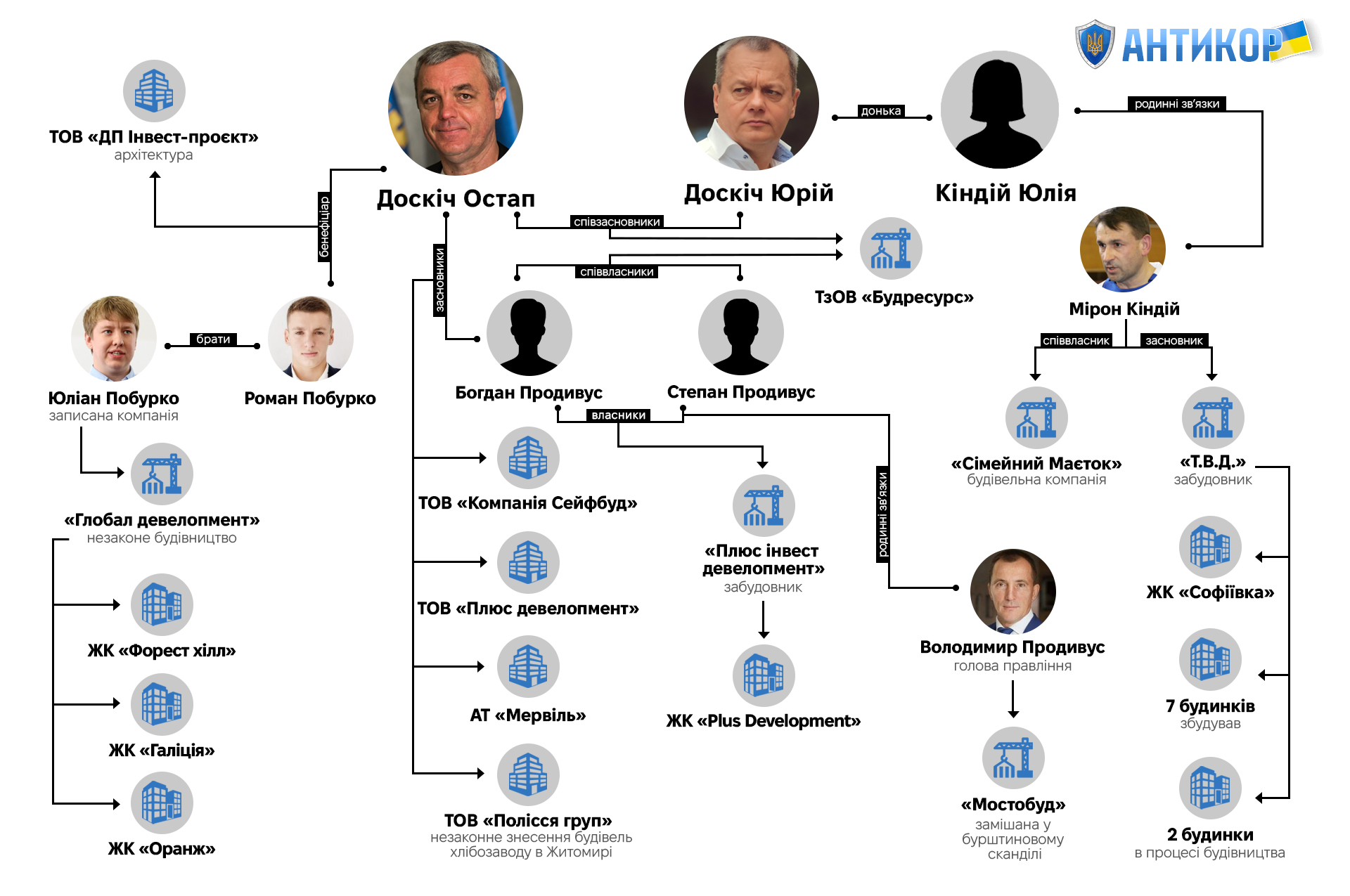 Будівництво – непростий бізнес і часто він пов’язаний із численними корупційними ризиками. Очевидно, що родині Доскічів це достеменно відомо. Адже в кожному з описаних чотирьох кейсів із бізнес-зв’язків є доля скандальності. Десь вона більша – як в історії з Продивусами, десь чисто сімейна – як то відвідини прокурорського весілля разом із партнерами по будівництву. Але так чи інакше всі ці історії дуже далекі від того добропорядного іміджу, який собі малюють Юрій та Остап Доскічі. І скільки би добра не приніс їхній благодійний фонд, все це дуже важко пов’язати з тим, скільки шкоди державі приносить їхня корупційна та протизаконна діяльність.