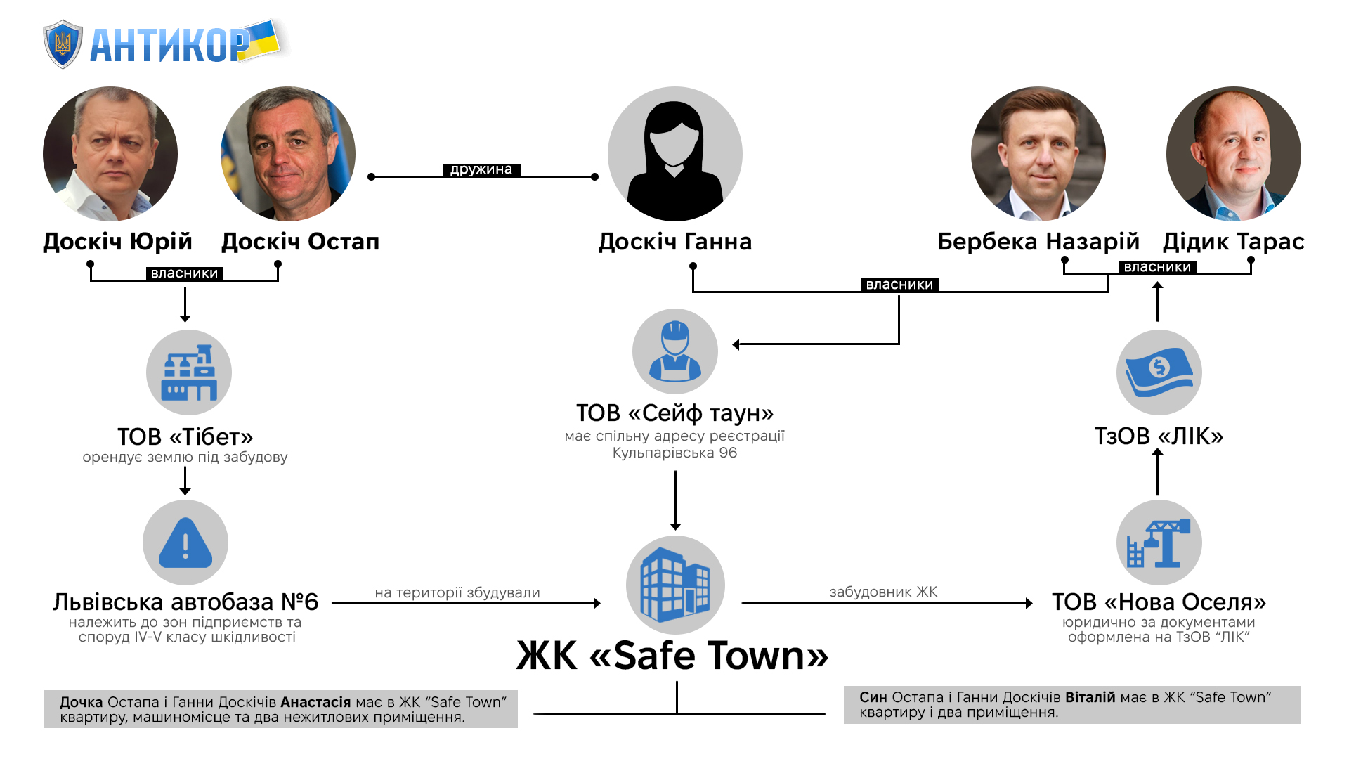 За цією адресою будується однойменний житловий комплекс «Safe town». Дочка Остапа і Ганни Доскічів Анастасія має в ньому квартиру, машиномісце та два нежитлових приміщення. Син Доскічів Віталій також має в ЖК «Safe town» одну квартиру і два приміщення.