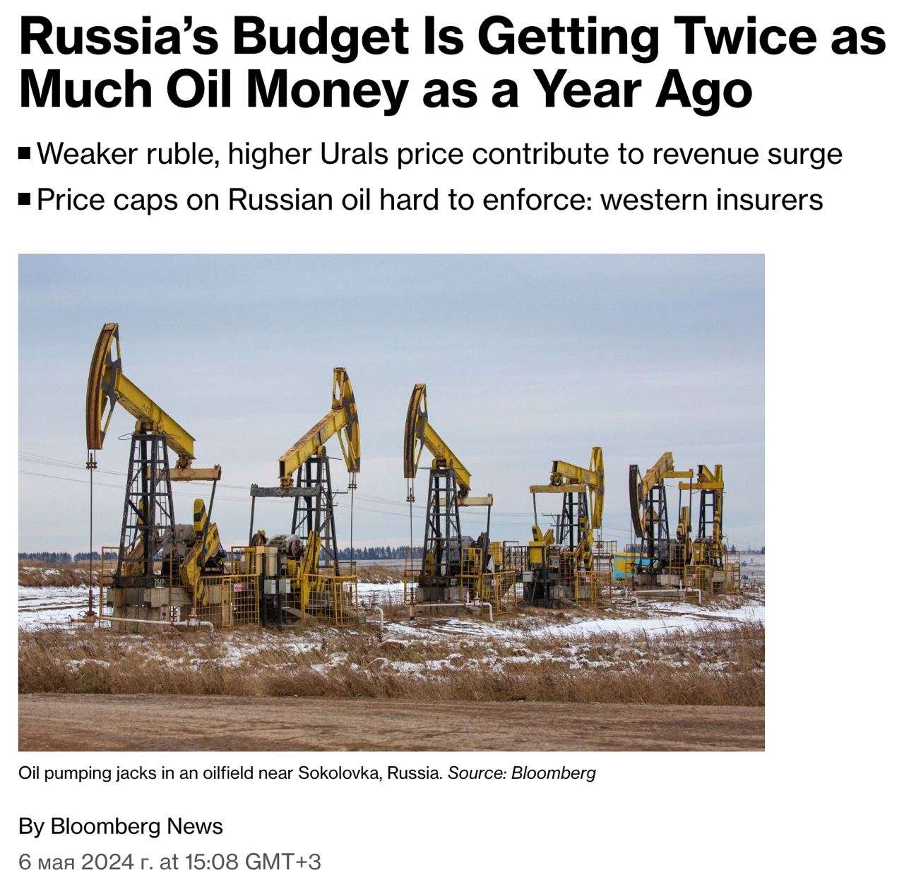Bloomberg із посиланням на дані російського мінфіну повідомляє, що доходи РФ від продажу нафти у квітні цього року зросли вдвічі порівняно з квітнем-2023, незважаючи на санкції.