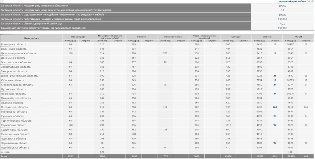 Также в Центризбирком поступили итоги выборов в 39 из 10562 местных советов.