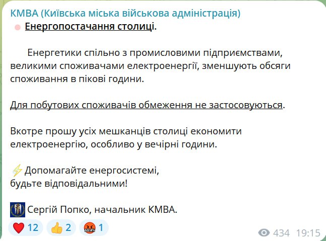 Для побутових споживачів обмежень немає, та їх просять економити електроенергію.